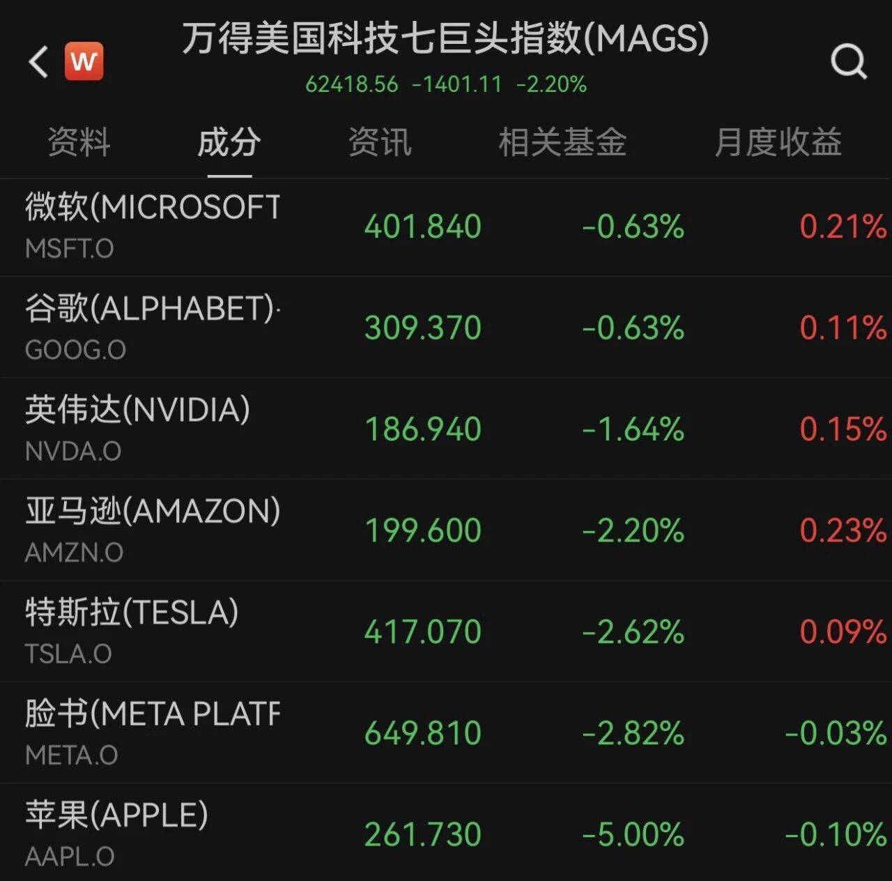 好意思股科技七巨头一起下降,万得好意思国科技七巨头指数下降2.20%。其中,苹果大跌5%,为2025年4月以来的最大单日跌幅。Meta、特斯拉、亚马逊跌超2%,英伟达下降1.64%,谷歌母公司Alphabet-C、微软均下降0.63%。