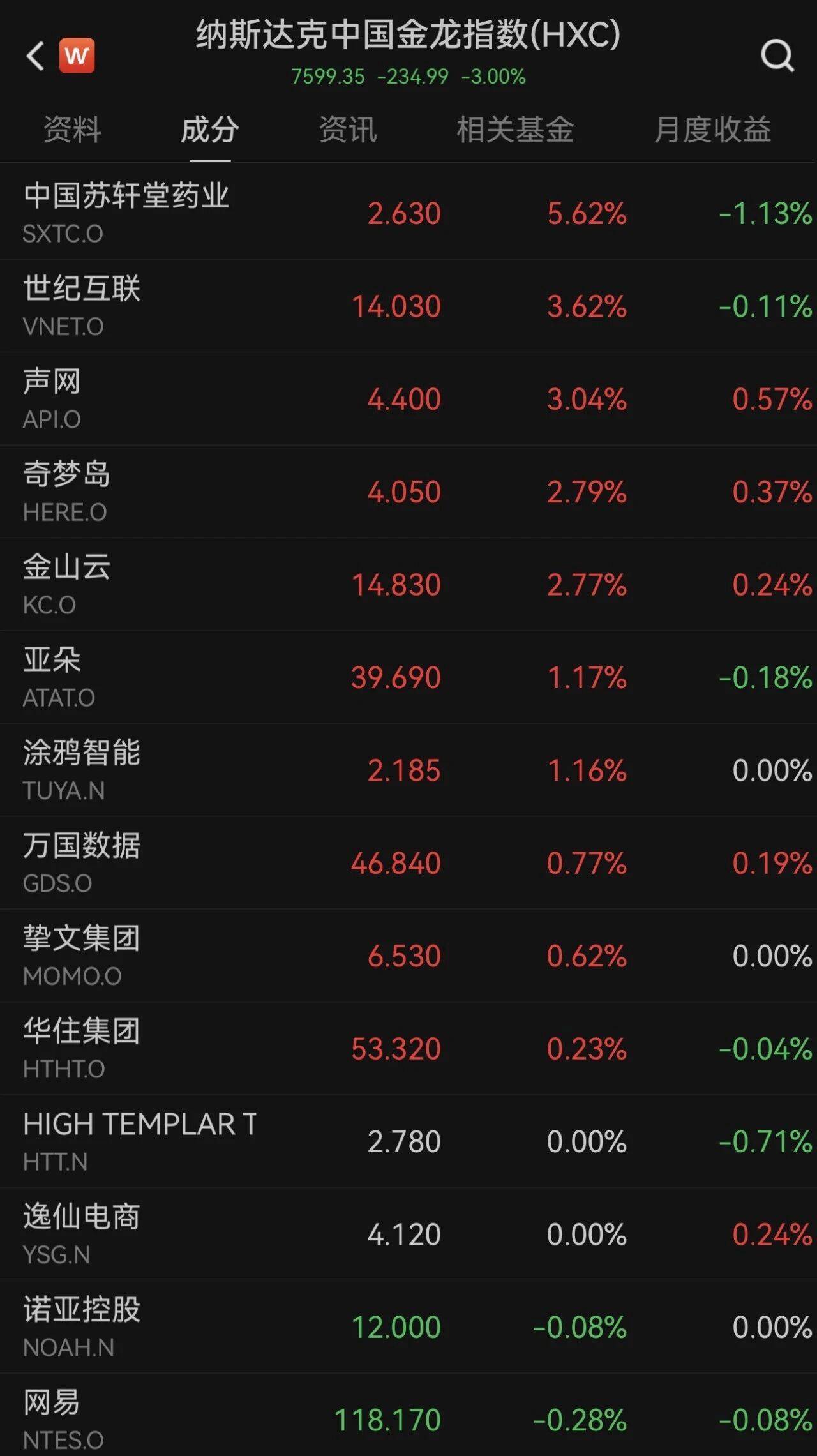 中概股涨跌不一,纳斯达克中国金龙指数下降3%。热点中概股方面,中国苏轩堂药业涨超5%,世纪互联、声网涨超3%,奇梦岛、金山云涨超2%;腾讯音乐、虎牙跌超10%,新氧下降6.76%,贝壳、爱奇艺跌超5%。