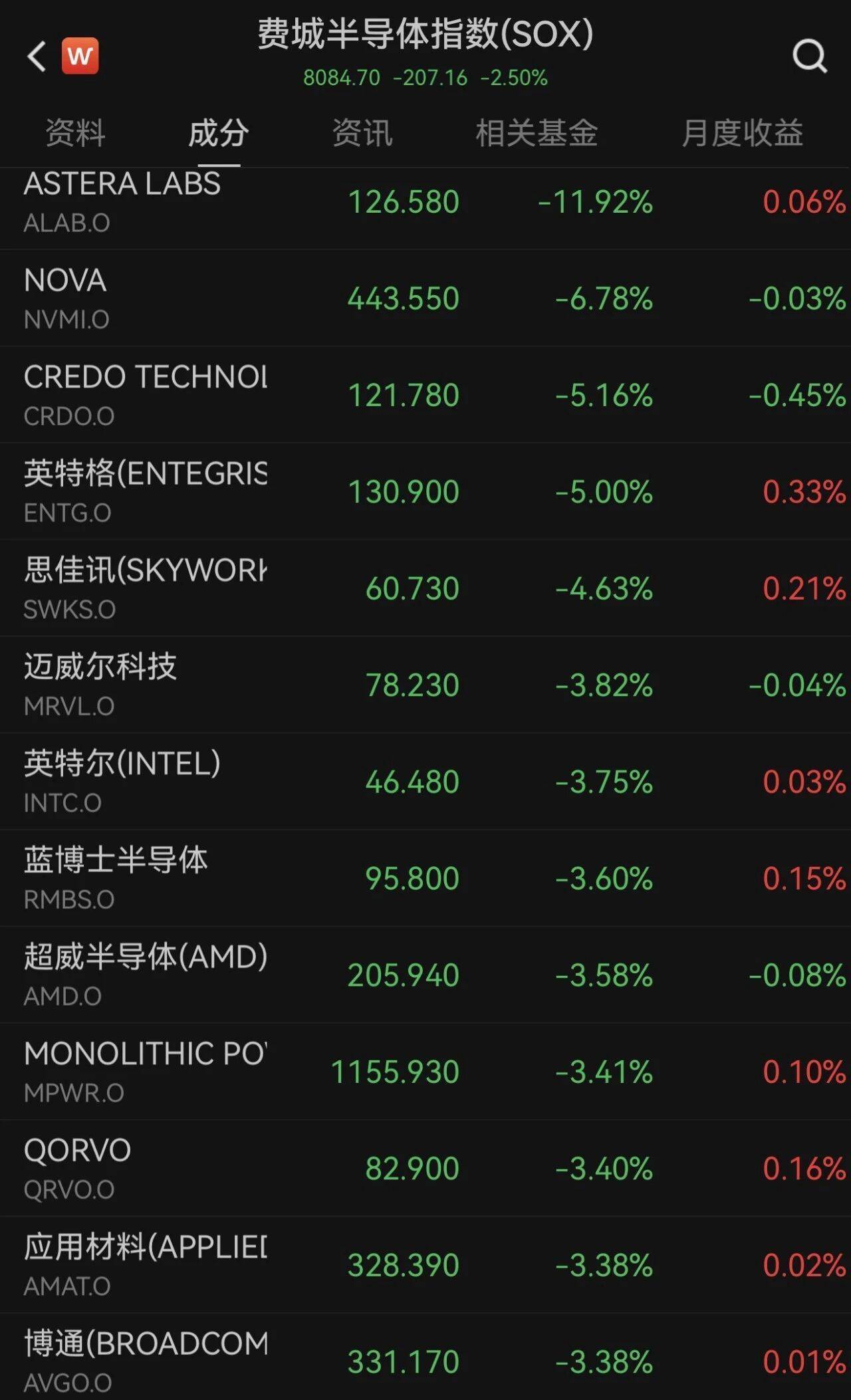 热点科技股普跌,费城半导体指数下降2.50%。指数因素股中,ASTERA LABS跌近12%,英特尔、超威半导体、博通等跌超3%。